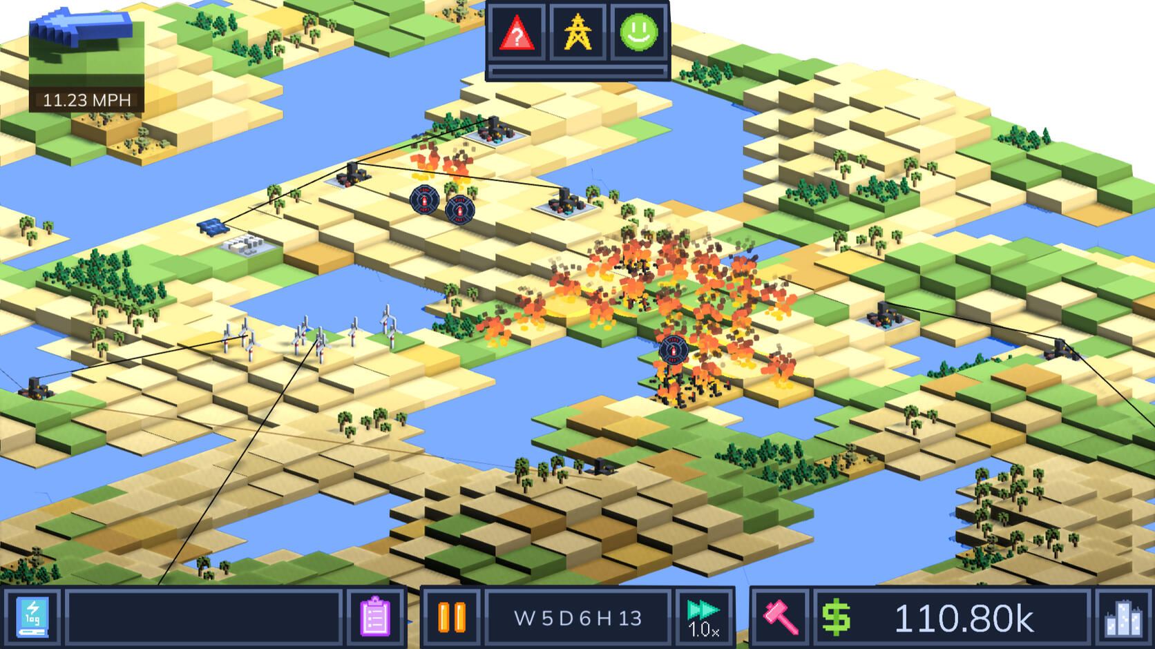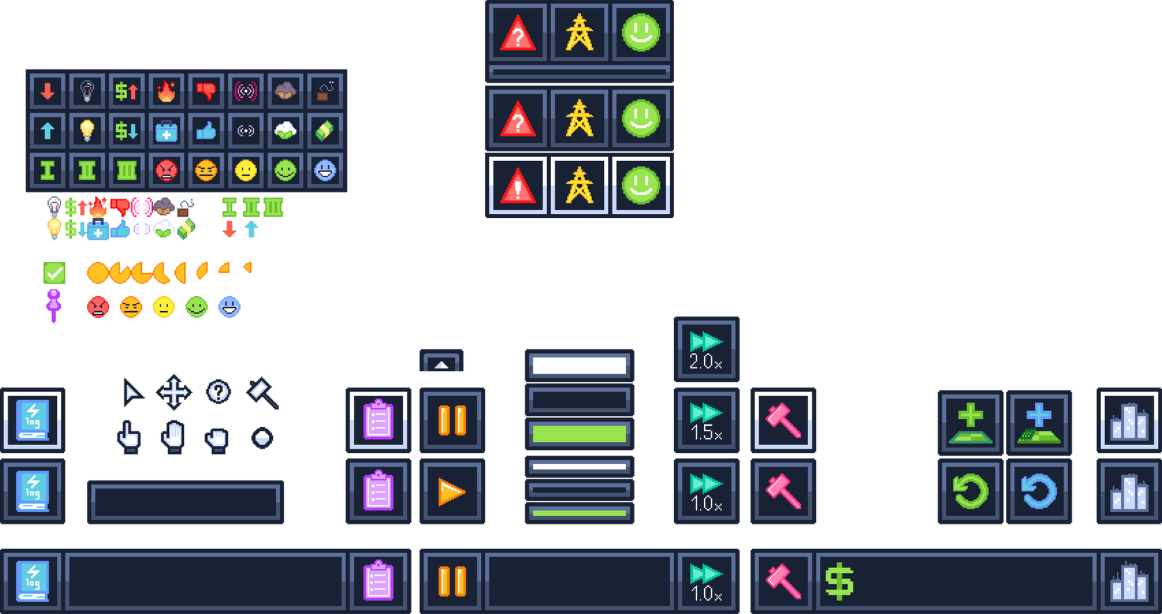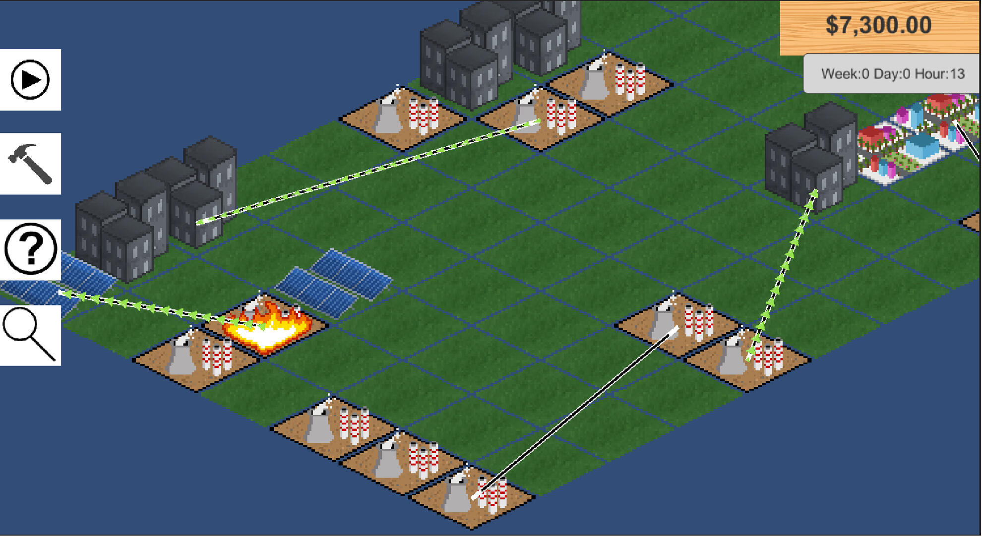 Over the course of my work on the game I pitched many changes to improve the UI and UX of the project. My initial "wooden" assets, while simple and clean, lacked the industrious feeling of a power grid simulation game. We also ran into a bit of an issue when the simple "blocky buttons" began filling up the left side of the screen, many of which were exceedingly situational.The most important aspect in a simulation game is screen real estate. I had to ensure the HUD did not get in the way of a player's ability to manage wildfires, assess their powerlines, or simply observe their cities.I remade the assets and reorganized the layout such that the most important buttons would be nearest to the center, and similar buttons would be bundled into contiguous categories. Menus expand and retract seamlessly, and scroll menus were employed to save space for indefinite lists, like cities and happiness modifiers. After my changes, even with an excessive amount of menus no peripheral HUD elements occupied the center of the screen. This allows players to assess their quests, manage their city power rates, and construct new tiles all while having a clear view of the map.