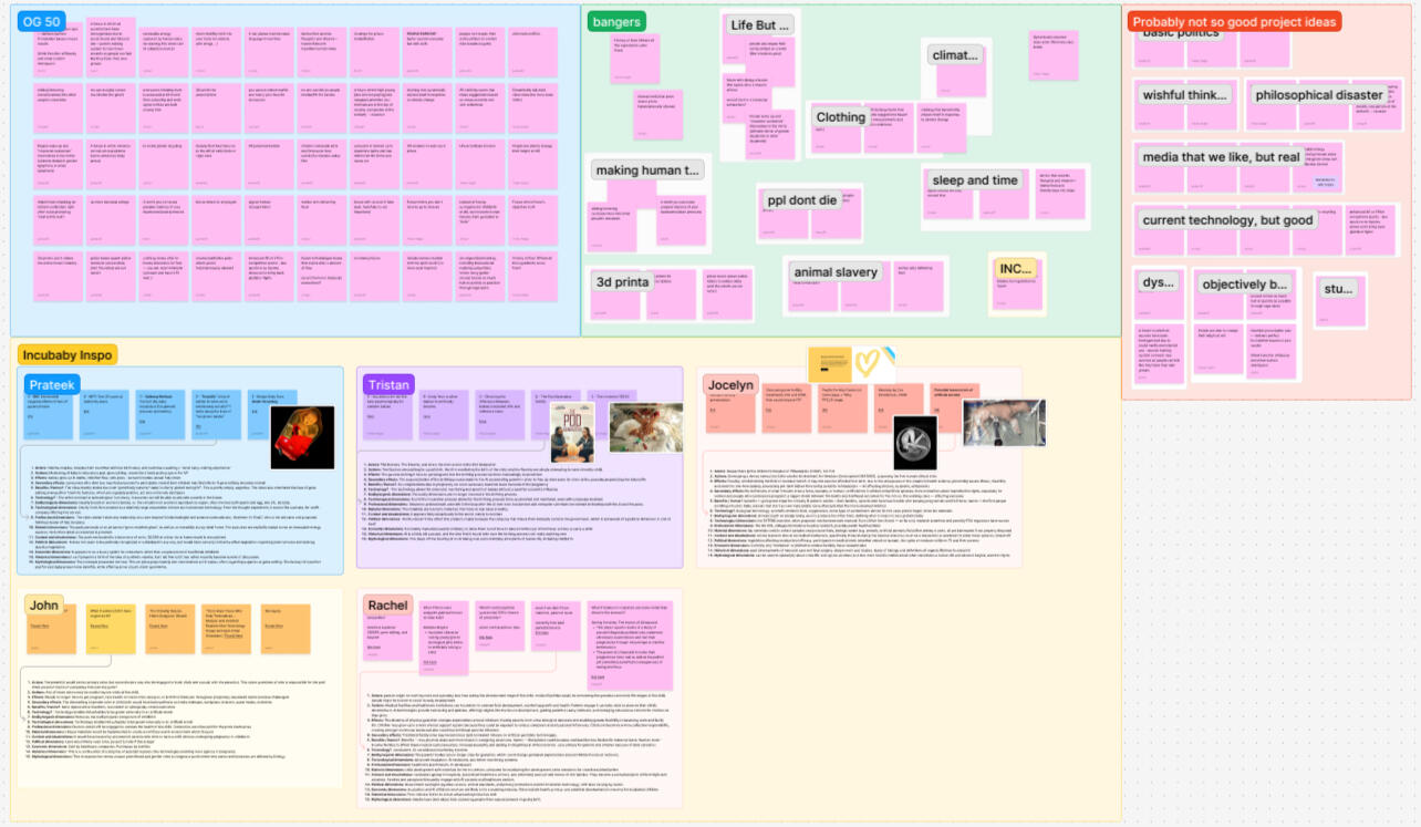 Pooling together 50 of our most outlandish thoughts for the future, we began a selective review proces. Topics were eliminated primarily on the basis of their sociopolitical impact, availability of peer reviewed research within their respective spaces, and general feasibility as a mobile application.In an era where reproductive agency is still so uncertain in one of the most developed nations on the planet, we felt passionate about alternative yet technologically feasible futures.Our fabulations gave birth (no pun intended) to a fictional synthetic womb monitoring app, Incubaby.