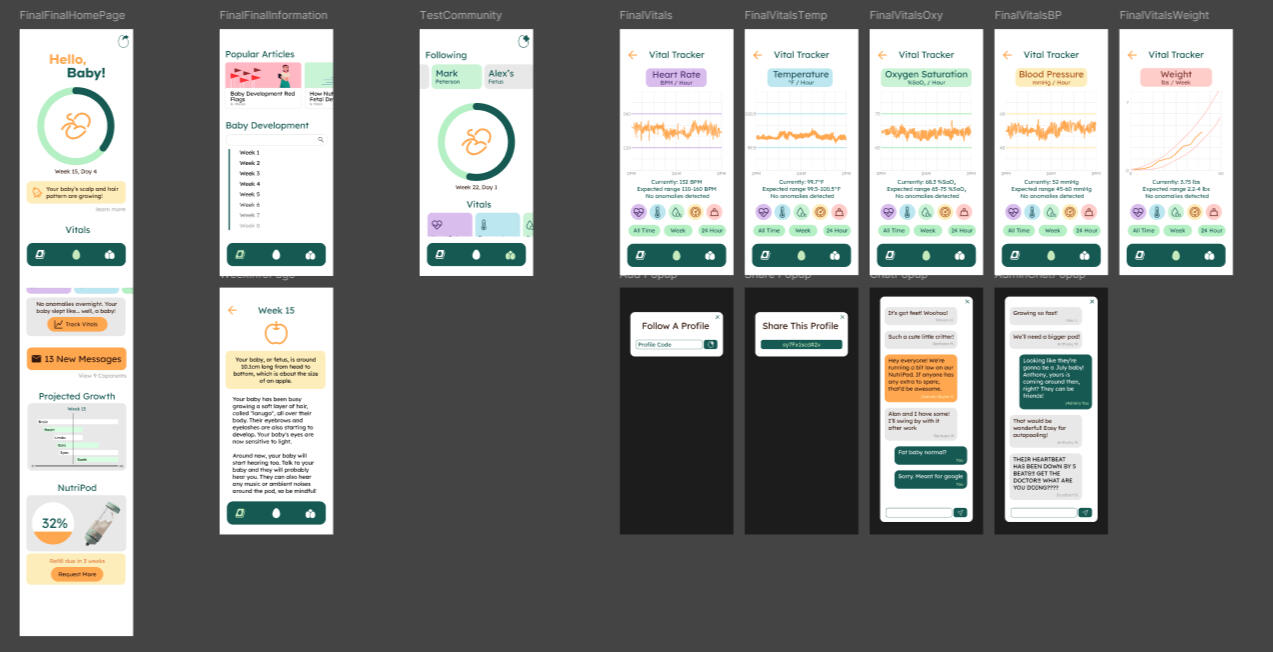 None of the interactive elements functioned in a capacity that was evocative of a professional medical app. We weren't doctors, but we still needed to prototype common sense features for parents. Simple considerations like "how can I monitor the history of vitals so there aren't any anomalies overnight" were complete oversights. The final version of the app doubled down on the informative pages, included an abudance of revamps to the social page to drill home the adverse impacts of vital tracking, and immensely expanded the vitals tracker to an intuitive timeline to ease helicopter parents.On top of this, aesthetic changes were necessary. We had a bit of a rough time bridging the sterile, informative nature of current medical interaction design with that of current consumer baby associations, but ultimately, colorful pastels allowed us to strike a balance that wasn’t too infantile, no pun intended.